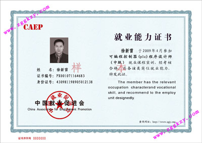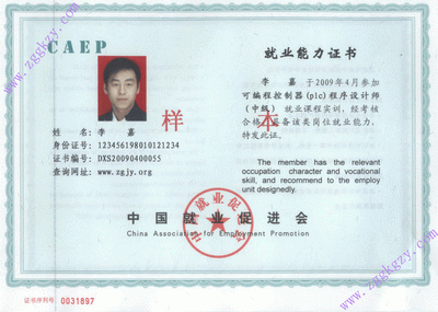 [正文]:人力资源和社会保障部中国就业促进会颁发《可编程控制器(plc)程序设计师》(中、高级)证书(样本图片)